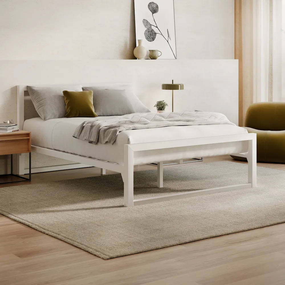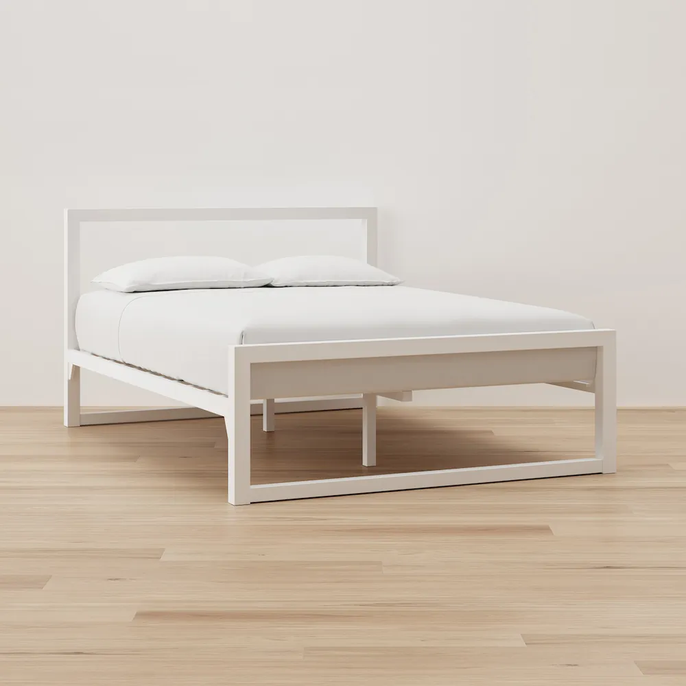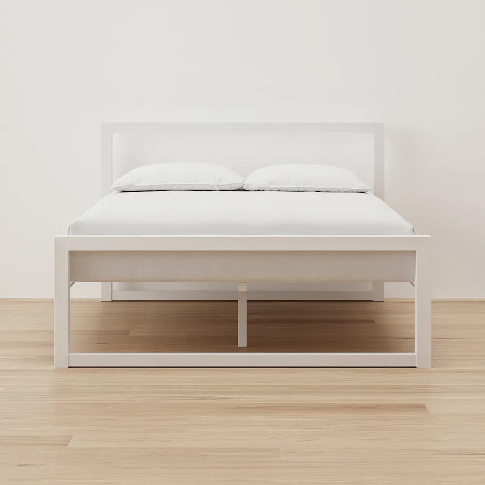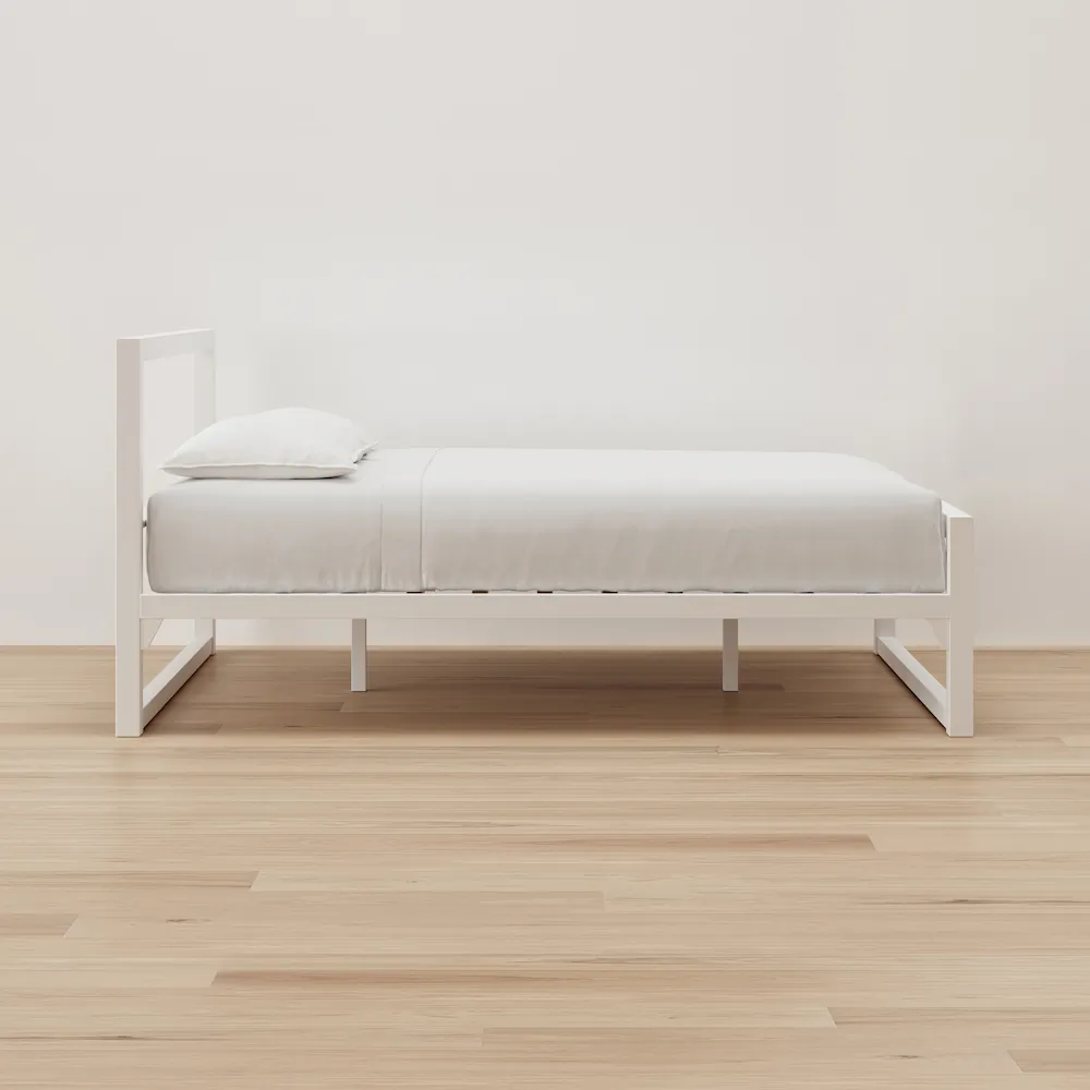 A powder-coated steel frame with a clean white finish and a headboard. Solid, straightforward, and no box spring needed.