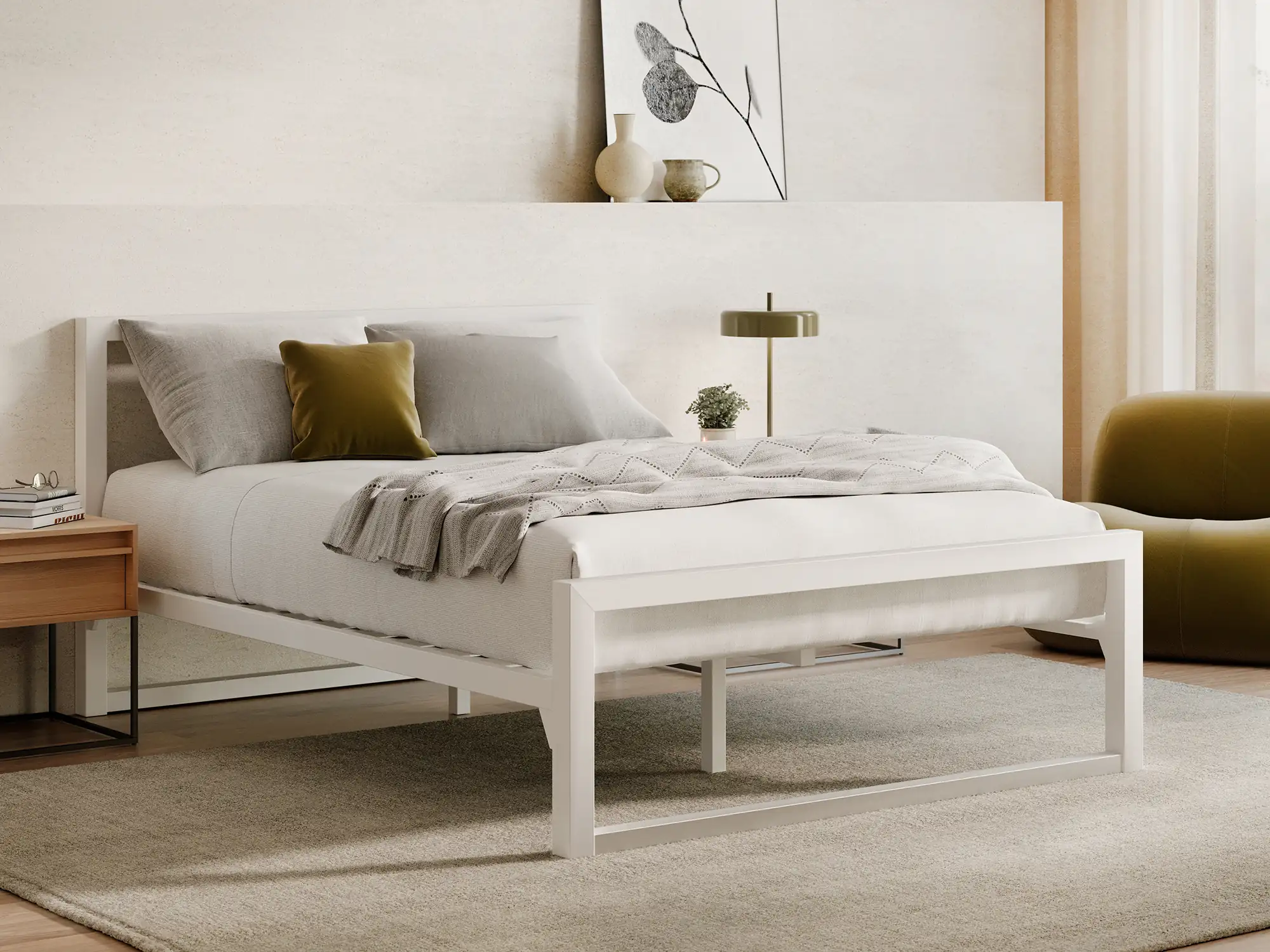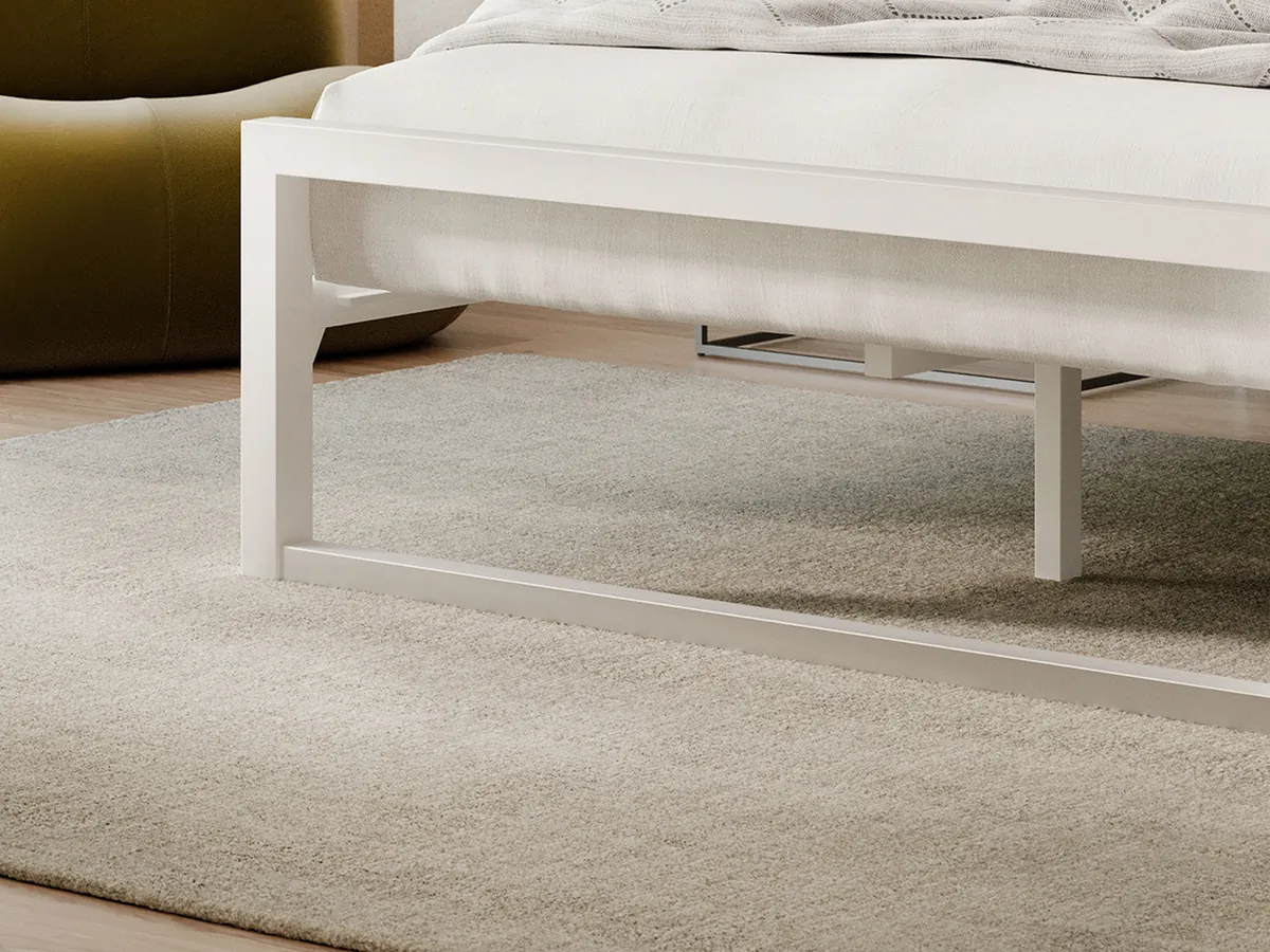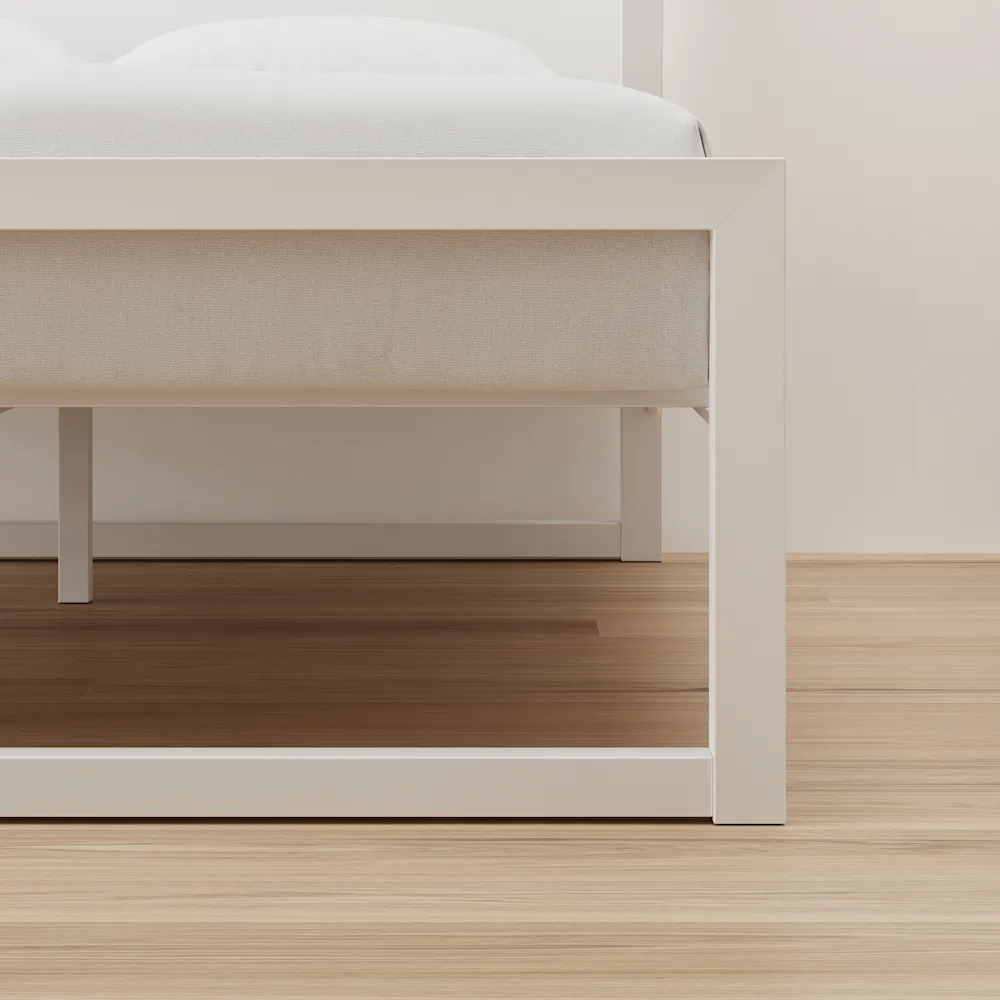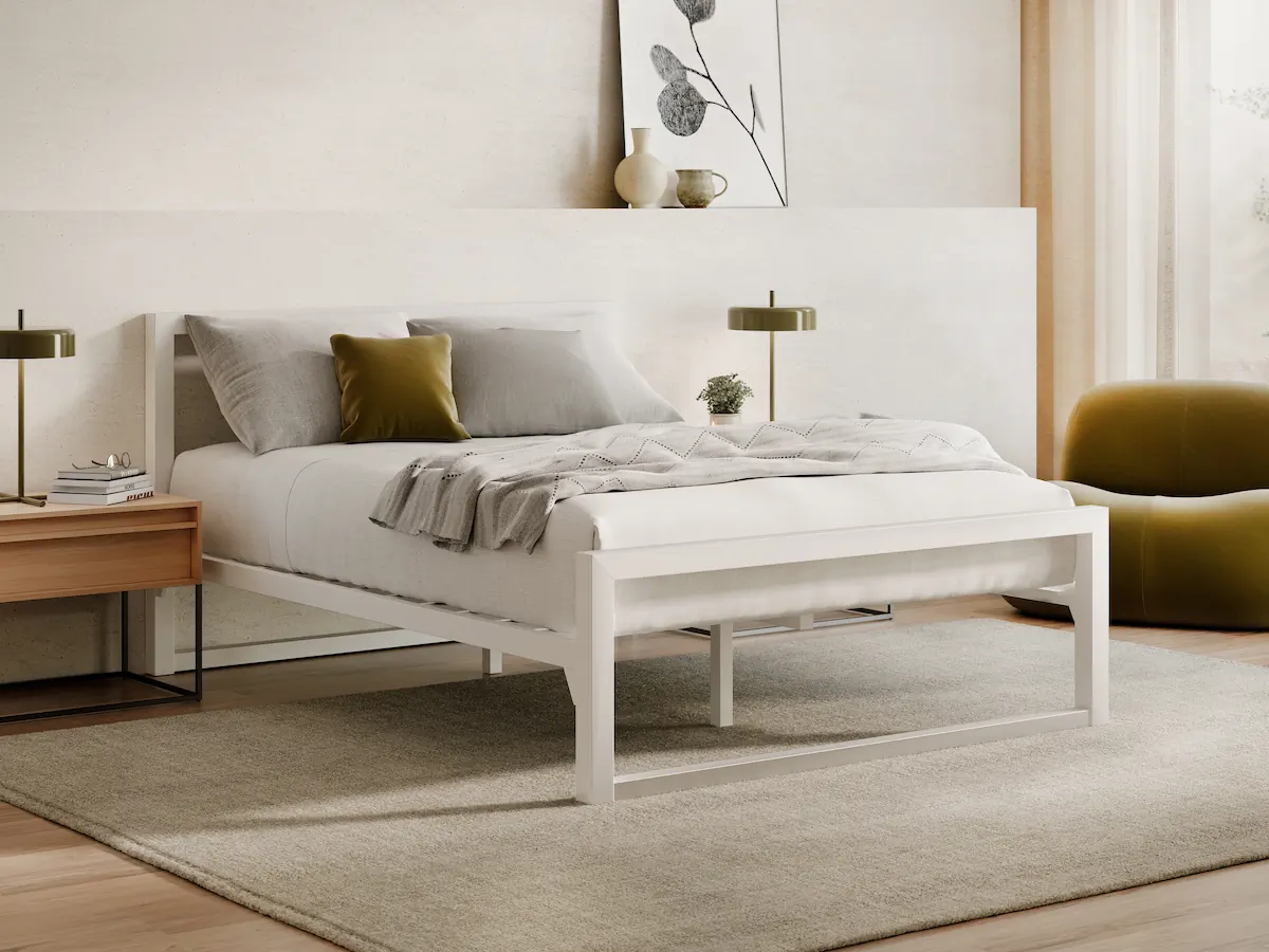 A powder-coated steel frame with a clean white finish and a headboard. Solid, straightforward, and no box spring needed.